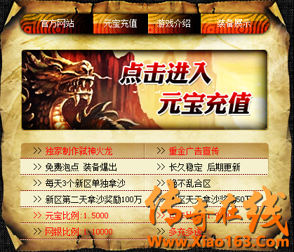 传奇在线 www.xiao163.com 版权所有 2008-2020 保留所有权利 打击盗版支持正版游戏 任何组织或个人未经同意 不得使用和传播盗版游戏 本站内容均自动采集互联网